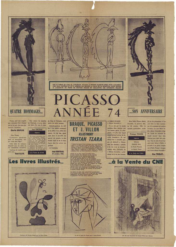 Απόκομμα, χαρτί, 60×43 εκ., στα γαλλικά, δημοσίευσης στην οποία αναγράφονται απόψεις για τον Pablo Picasso με αφορμή τα 74α γεννέθλιά του. Ειδικότερα, μεταφέρονται κρίσεις των René Clair, Jean Cocteau, Elsa Triolet.