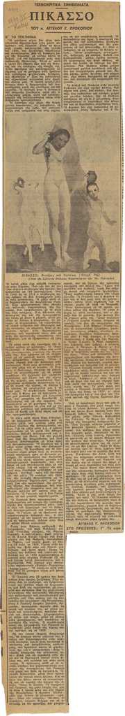 Απόκομμα, χαρτί, στα ελληνικά, δημοσίευσης άρθρου αναφερόμενου στην αρχή της καλλιτεχνικής δραστηριότητας του Pablo Picasso.