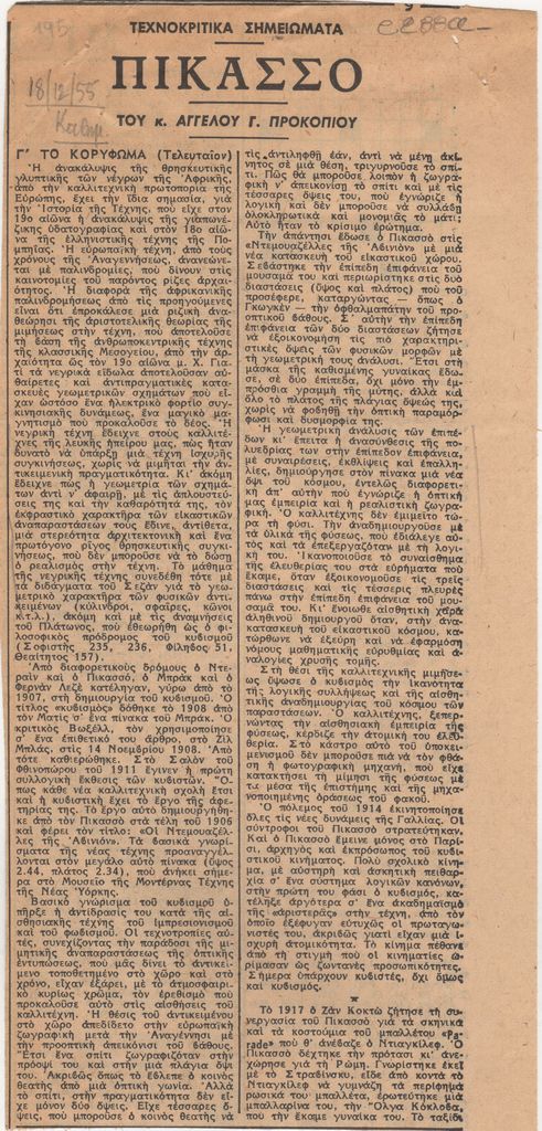 Απόκομμα, χαρτί, 2 φφ, 25×12 εκ., στα ελληνικά, δημοσίευσης αναφερόμενης στην εξελικτική πορεία της ζωγραφική του Pablo Picasso. Γίνονται αναφορές σε έργα που φιλοτέχνησε.
