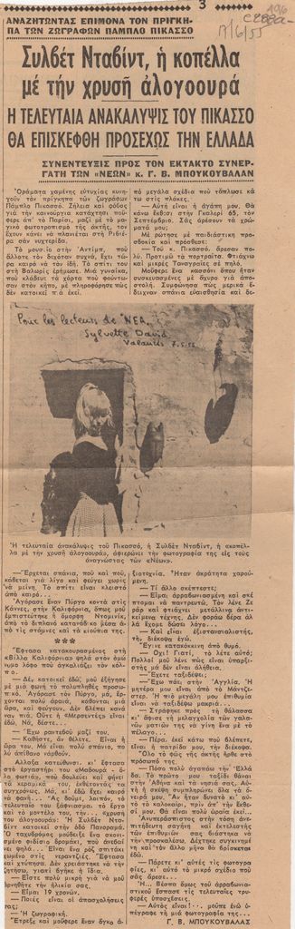 Απόκομμα, χαρτί, 35×11 εκ., στα ελληνικά, δημοσίευσης συνέντεξης της Sylvette David, μοντέλου του Pablo Picasso.