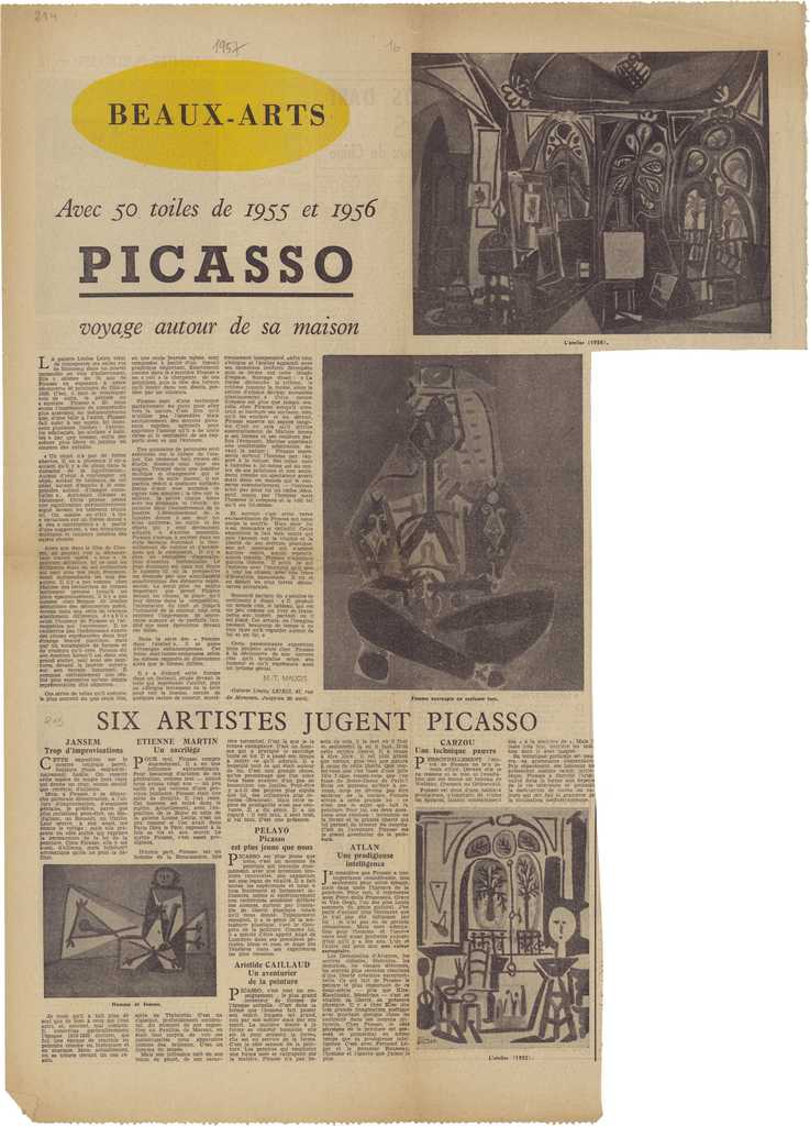 Απόκομμα, χαρτί ακανόνιστου μεγέθους, στα γαλλικά, δημοσίευσης που μεταφέρει κρίσεις των Jansem, Et. Martin, Pelayo, A. Caillaud, Atlan, Carzou για τον Pablo Picasso. Το απόκομμα εικονογραφείται.