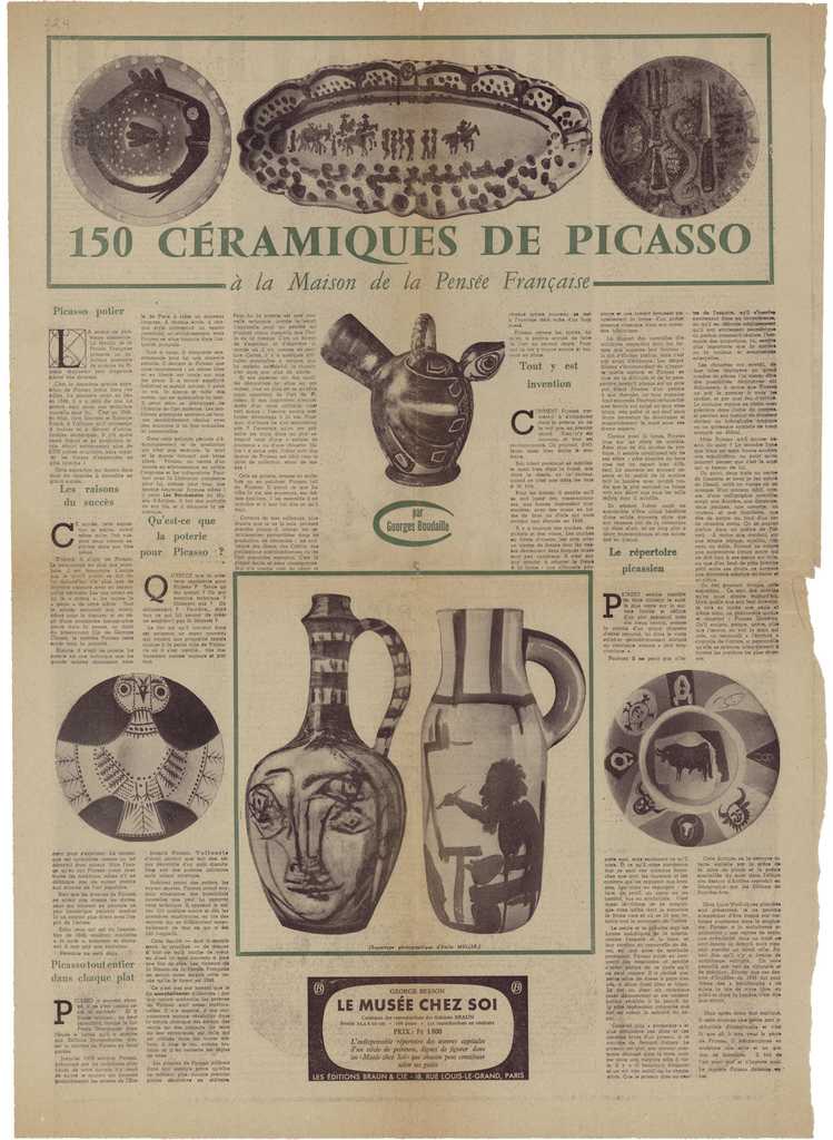 Απόκομμα, χαρτί, 60×43 εκ., στα γαλλικά, δημοσίευσης κριτικής έκθεσης του Pablo Picasso, η οποία διεξάγεται στην Maison de la Pensée στο Παρίσι.