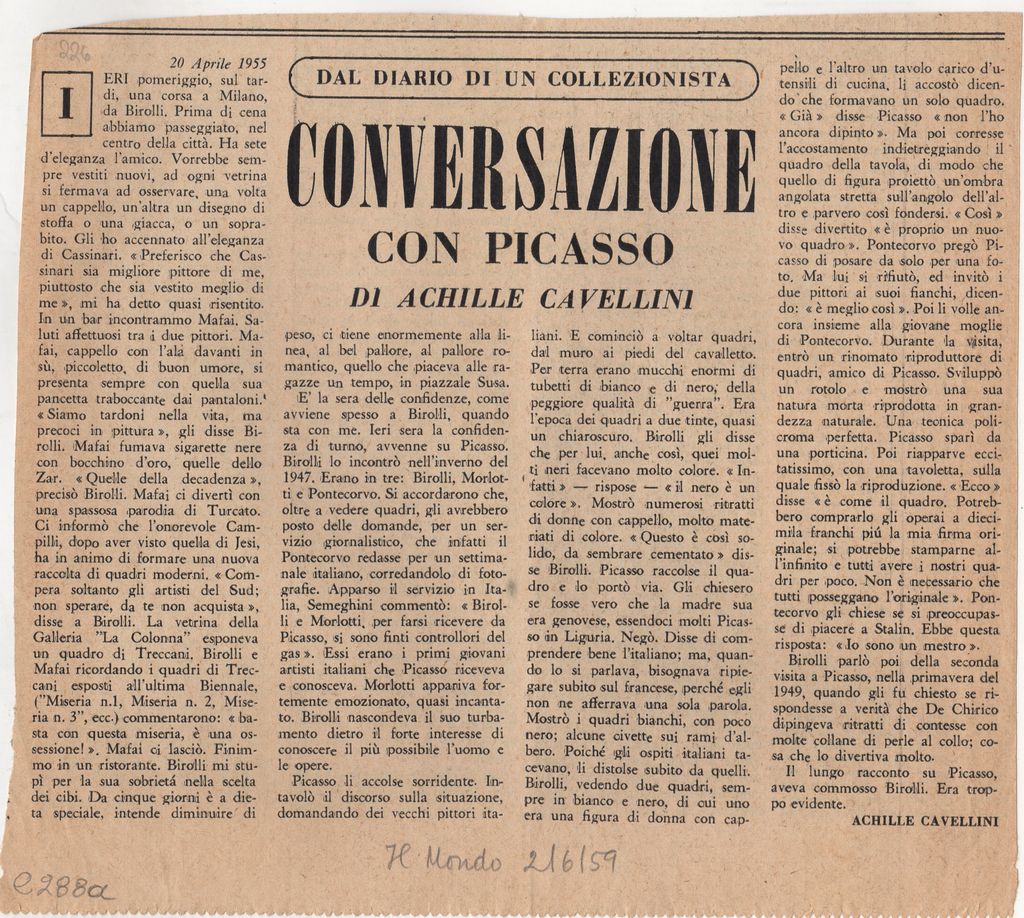 Απόκομμα, χαρτί, 20×22 εκ., στα ιταλικά, κειμένου το οποίο μεταφέρει συζήτηση με τον Pablo Picasso.