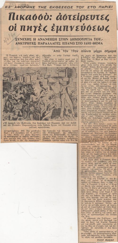 Απόκομμα, χαρτί ακανόνιστου μεγέθους, στα ελληνικά, δημοσίευσης αναφερόμενης στον Pablo Picasso. Σχολιάζεται η συνεχής παραγωγή έργων.