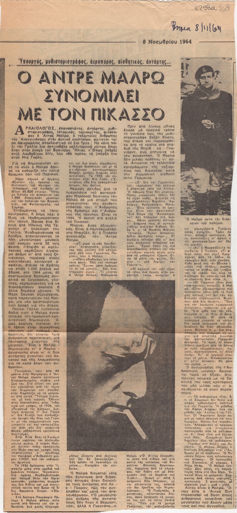 Απόκομμα, χαρτί, 37×17 εκ., στα ελληνικά, δημοσίευσης αναφερόμενης στον André Malraux. Δίνονται αποσπάσματα διηγήσεών του με αναφορά στον Pablo Picasso.