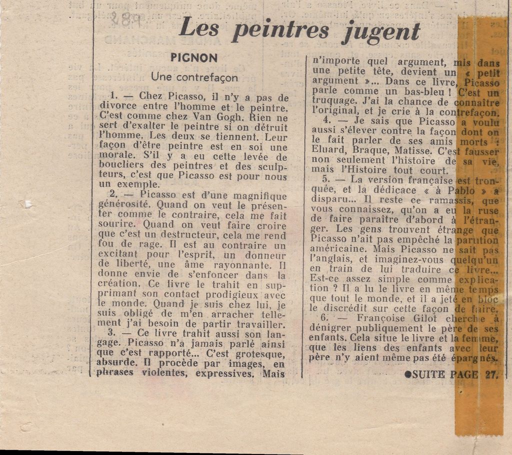 Απόκομμα, χαρτί, 43×17,5 εκ., στα γαλλικά, δημοσίευσης κρίσεων ζωγράφων για τον Pablo Picasso.