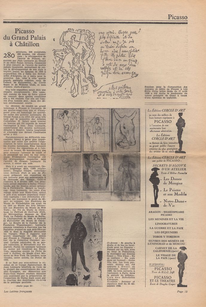 Απόκομμα, χαρτί, 2 φφ, 43×30 εκ., στα γαλλικά, δημοσίευσης κριτικών αναδρομικών εκθέσεων αφιερωμένες στον Pablo Picasso, στο Grand Palais, Galerie Louise Leiris, Galerie Alex Maguy και στο Châtillon.