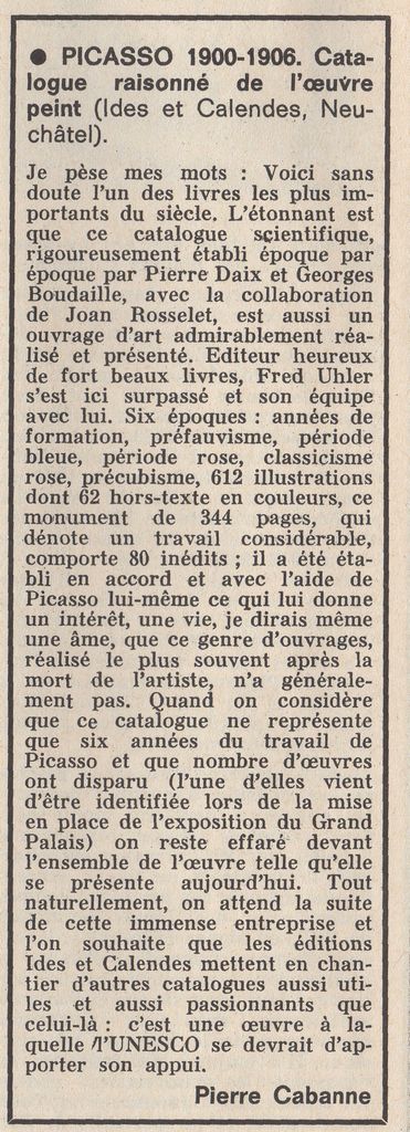 Απόκομμα, χαρτί, 27,5×21 εκ., στα γαλλικά, δημοσίευσης βιβλιοκριτικής έκδοσης για τον Pablo Picasso.