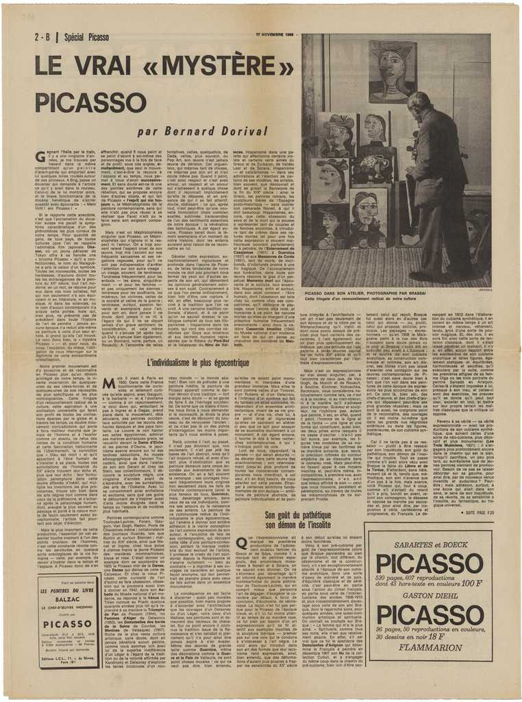 Απόκομμα, χαρτί, 2 φφ, 60×42 εκ., στα γαλλικά, δημοσίευσης αναφερόμενης στον Pablo Picasso. Σχολιάζεται η προσωπικότητα του καλλιτέχνη και το εικαστικό του έργο.