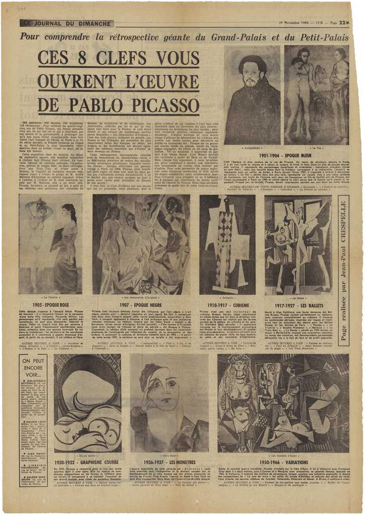 Απόκομμα, χαρτί, 60×42 εκ., στα γαλλικά, δημοσίευσης άρθρου αναφερόμενου στις καλλιτεχνικές περιόδους του Pablo Picasso. Αφορμή για το άρθρο, η μεγάλη αναδρομική έκθεση που διοργανώνεται στο Grand και Petit Palais, αφιερωμένη στον καλλιτέχνη για τα 85 χρόνια από τη γέννησή του.