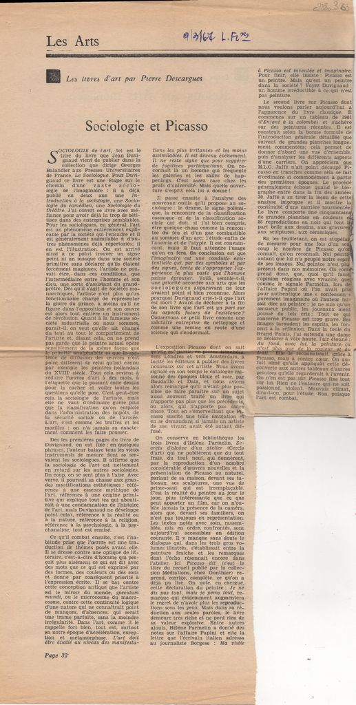 Απόκομμα, χαρτί ακανόνιστου μεγέθους, στα γαλλικά, δημοσίευσης βιβλιοκριτικών. Ειδικότερα, σχολιάζονται οι εξής κυκλοφορίες: το “Sociologie de l’ art” του Pierre Descargues για την κοινωνιολογία της Τέχνης και κυκλοφορίες για τον Pablo Picasso. Ειδικότερα, οι τρεις τόμοι της H. Parmelin και αυτό των Boudaille και Daix.