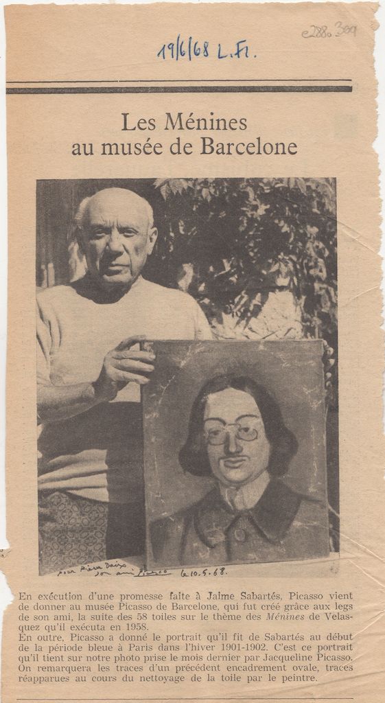 Απόκομμα, χαρτί, 25.5×13.5 εκ., στα γαλλικά, δημοσίευσης αναφερόμενης στη δωρεά έργων του Pablo Picasso στο Μουσείο Picasso της Βαρκελώνης. Δίνονται σχετικές πληροφορίες.