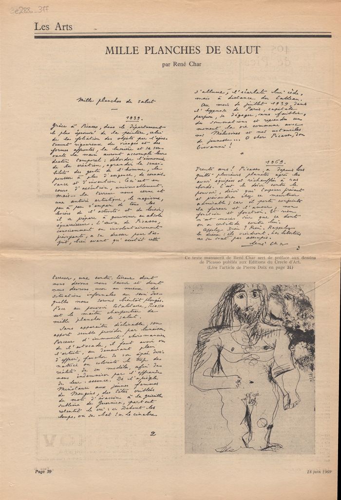 Απόκομμα, χαρτί, 43×30 εκ., στα γαλλικά, δημοσίευσης τμήματος χειρόγραφου κειμένου του René Char για τον Pablo Picasso. Πρόκειται για τμήμα προλόγου έκδοσης για τον καλλιτέχνη, αφιερωμένης στα σχέδια του Picasso.