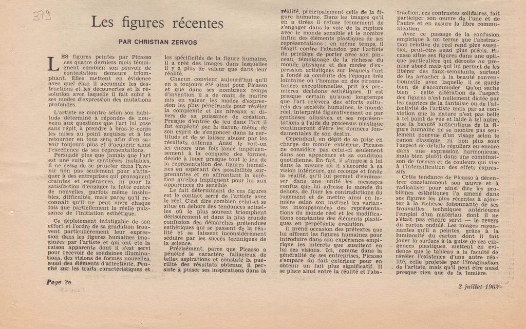 Απόκομμα, χαρτί, 43×30 εκ., στα γαλλικά, δημοσίευσης κριτικής έκθεσης του Pablo Picasso, η οποία διεξάγεται στην γκαλερί Yvonne Zervos στο Παρίσι. Σχολιάζονται τα έργα του καλλιτέχνη.