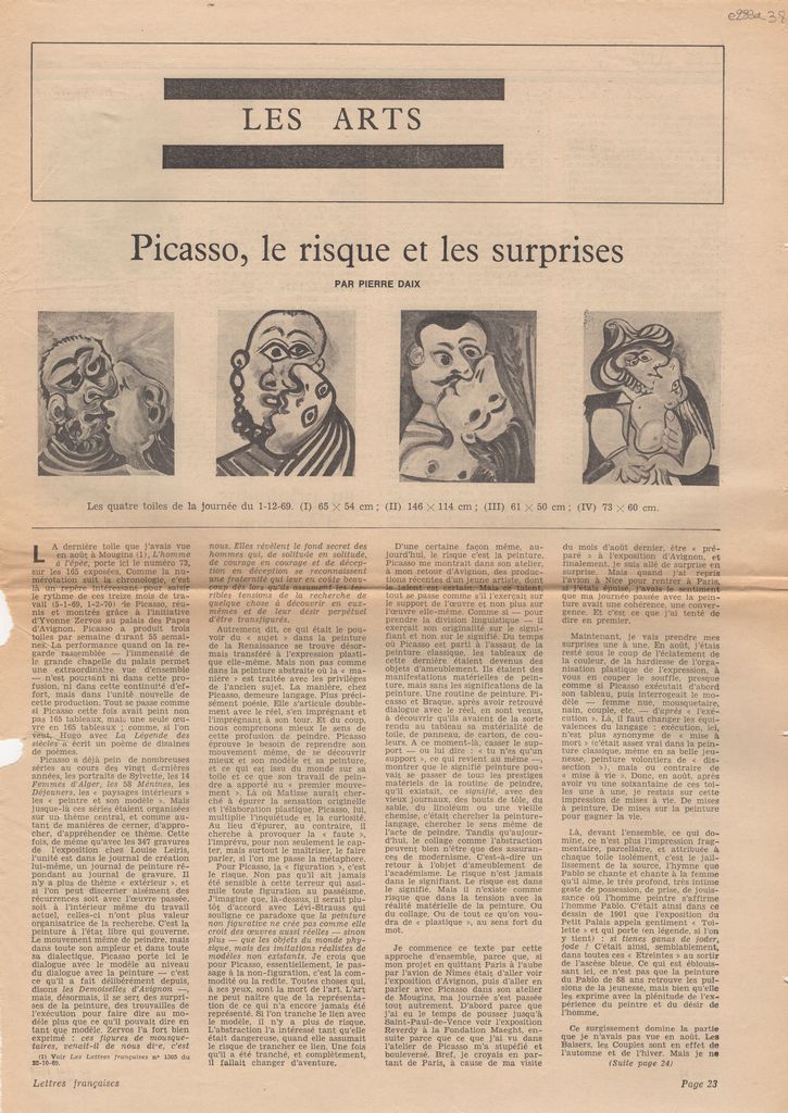 Απόκομμα, χαρτί, 43×30 εκ., στα γαλλικά, δημοσίευσης κριτικής έκθεσης του Pablo Picasso, η οποία διεξάγεται στην Avignon στο πλαίσιο του 24ου Φεστιβάλ της πόλης.