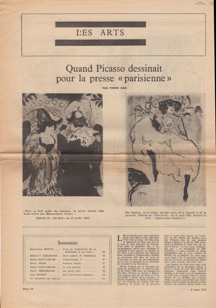 Απόκομμα, χαρτί, 2 φφ, 43×30 εκ., στα γαλλικά, δημοσίευσης άρθρου αναφερόμενου σε σχέδια του Pablo Picasso, τα οποία παρουσιάζονταν σε έντυπα που κυκλοφορούσαν στο Παρίσι.