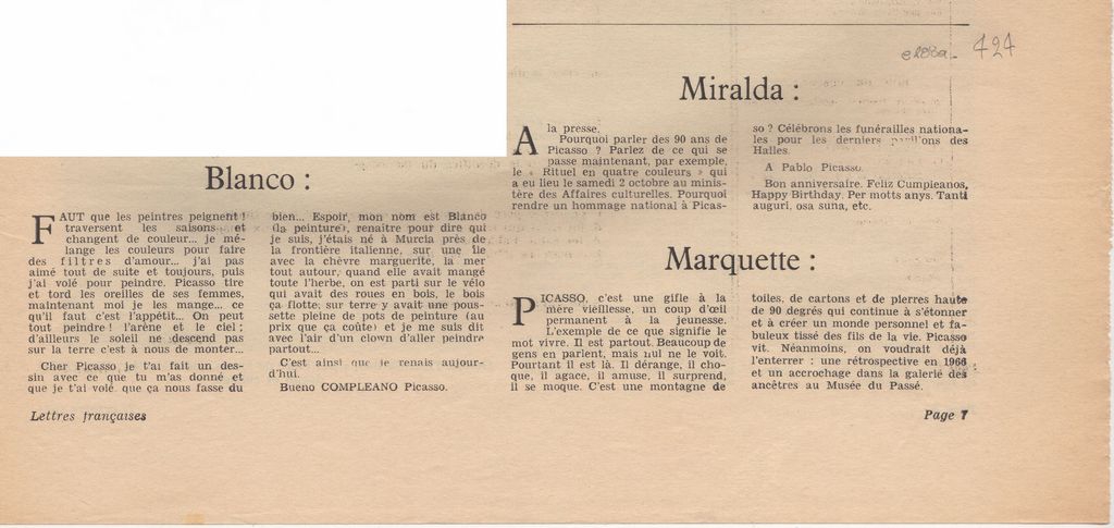 Απόκομμα, χαρτί, 2 φφ, 43×30 εκ., στα γαλλικά, δημοσίευσης η οποία περιέχει κρίσεις νέων καλλιτεχνών για τον Pablo Picasso, στο πλαίσιο αφιερώματος του εντύπου για τη συμπλήρωση 90 χρόνων από το θάνατο του καλλιτέχνη.