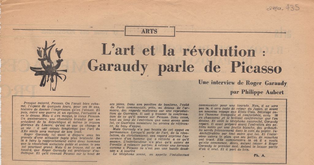 Απόκομμα, χαρτί, 43×30 εκ., στα γαλλικά, δημοσίευσης αναφερόμενης σε συνέντευξη του Roger Garaudy για τον Pablo Picasso. Σχολιάζεται η κοινή πορεία των δυο προσώπων στα πολιτικά. Ο Garaudy μιλά για την αναδρομική-αφιερωματική έκθεση για τον καλλιτέχνη στο Λούβρο και για το εικαστικό του έργο.