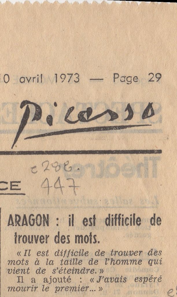 Απόκομμα, χαρτί, 18×30 εκ., στα γαλλικά, δημοσίευσης δήλωσης του Aragon για τον θάνατο του Pablo Picasso.