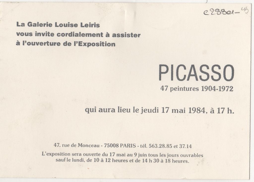 Πρόσκληση, χαρτόνι, 10,5×15 εκ., στα γαλλικά, εγκαινίων έκθεσης ζωγραφικής του Pablo Picasso στο Παρίσι.