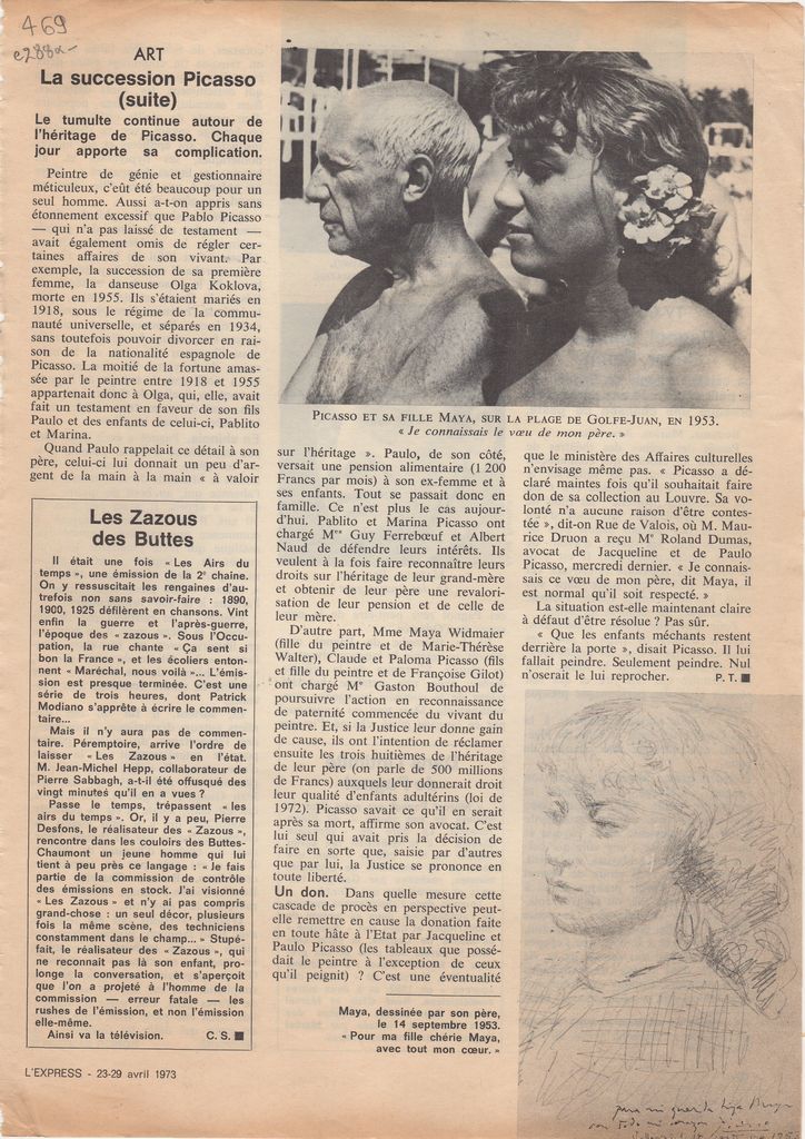 Απόκομμα, χαρτί, 28×21 εκ., στα γαλλικά, δημοσίευσης άρθρου αναφερόμενου σε εντάσεις που υπάρχουν ανάμεσα στους κληρονόμους του Pablo Picasso. Ακόμη σχολιάζεται δωρεά έργων του καλλιτέχνη στο γαλλικό κράτος. Δίνονται πληροφορίες.