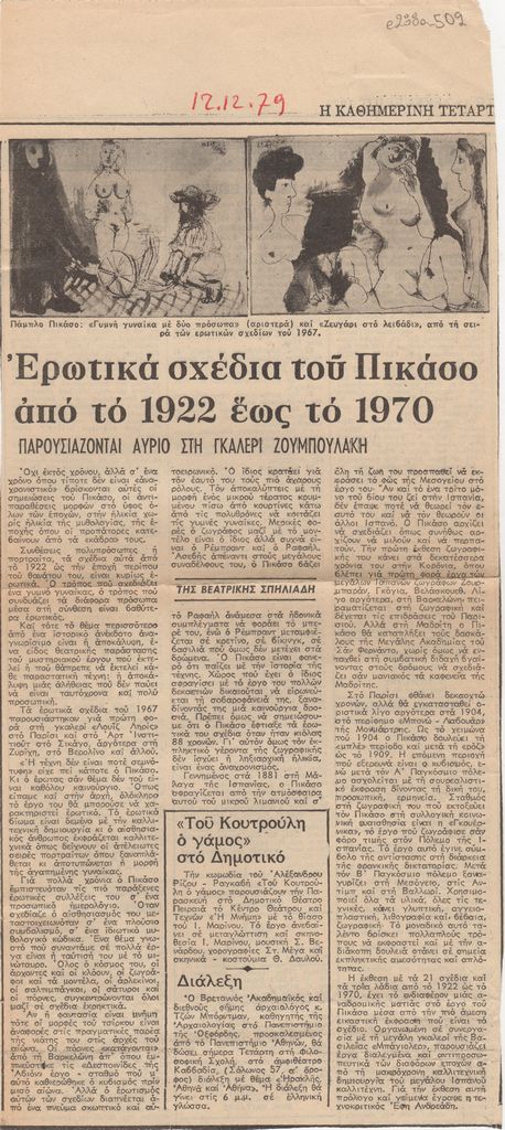 Απόκομμα, χαρτί, 35×15.5 εκ., στα ελληνικά, δημοσίευσης κριτικής έκθεσης έργων του Pablo Picasso, η οποία διεξάγεται στην γκαλερί Ζουμπουλάκη στην Αθήνα.