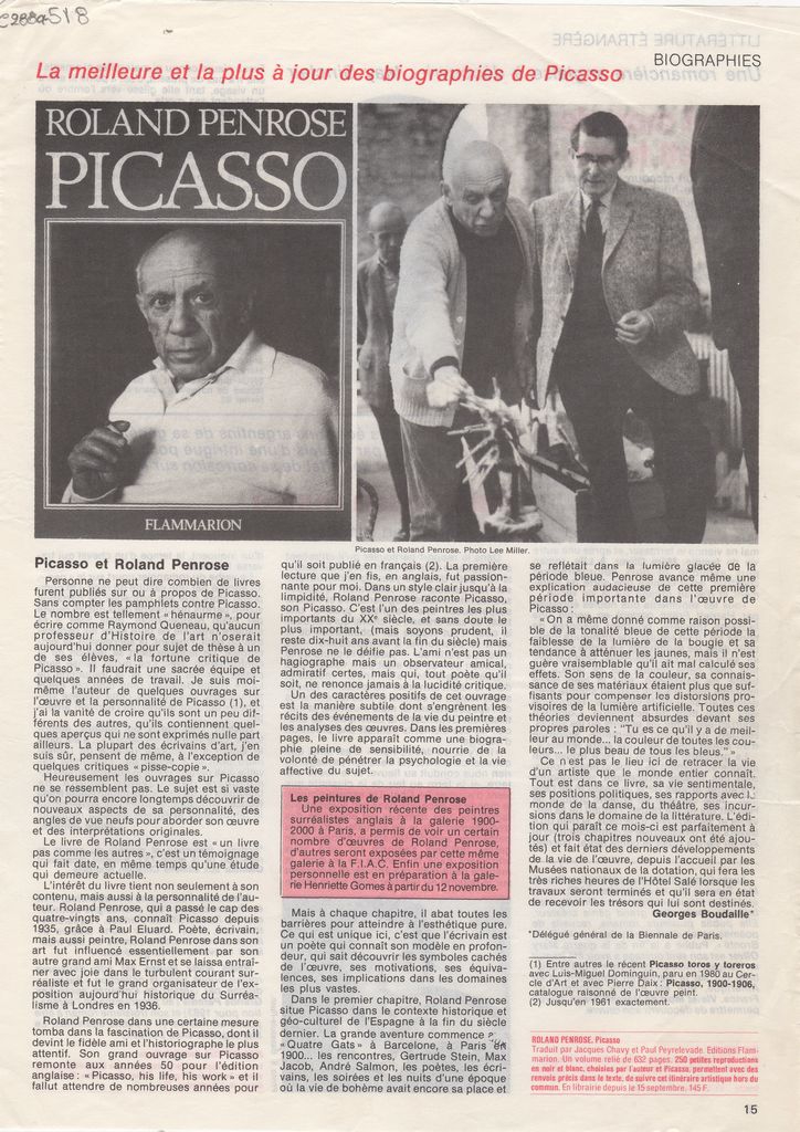 Απόκομμα, χαρτί, 29×21 εκ., στα γαλλικά, δημοσίευσης κριτικής βιογραφίας του Pablo Picasso. Σχολιάζεται το πόνημα του Roland Penrose και γίνεται αναφορά σε εκθέσεις του.