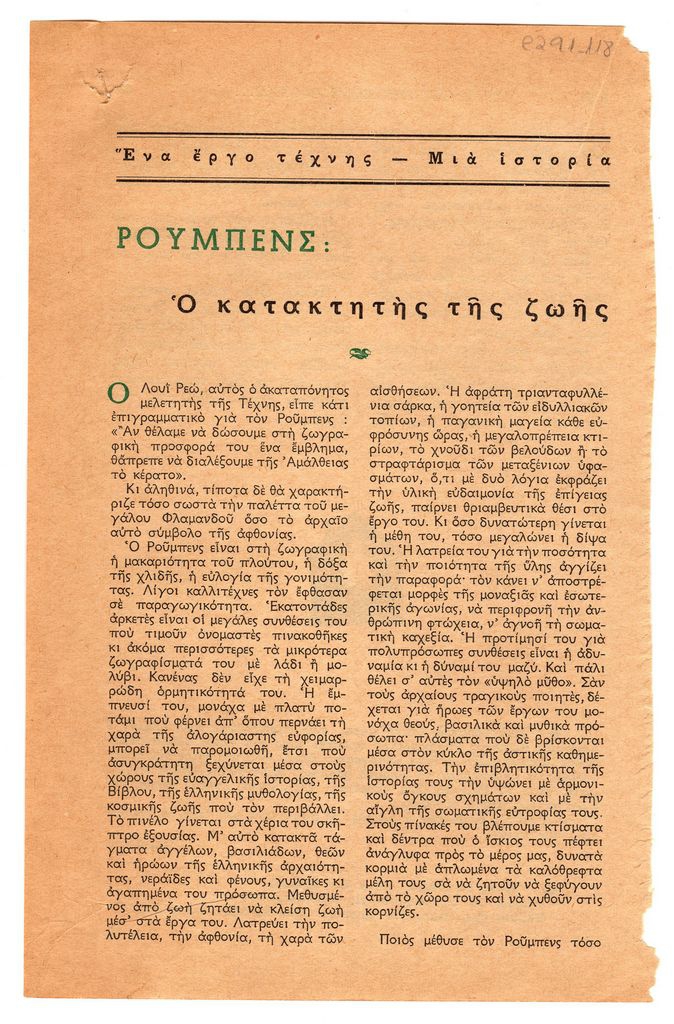 Απόκομμα, χαρτί, 3 φφ, 21×13 εκ., στα ελληνικά, δημοσίευσης κειμένου αφιερωμένου στη ζωή και στο εικαστικό έργο του Peter Paul Rubens.