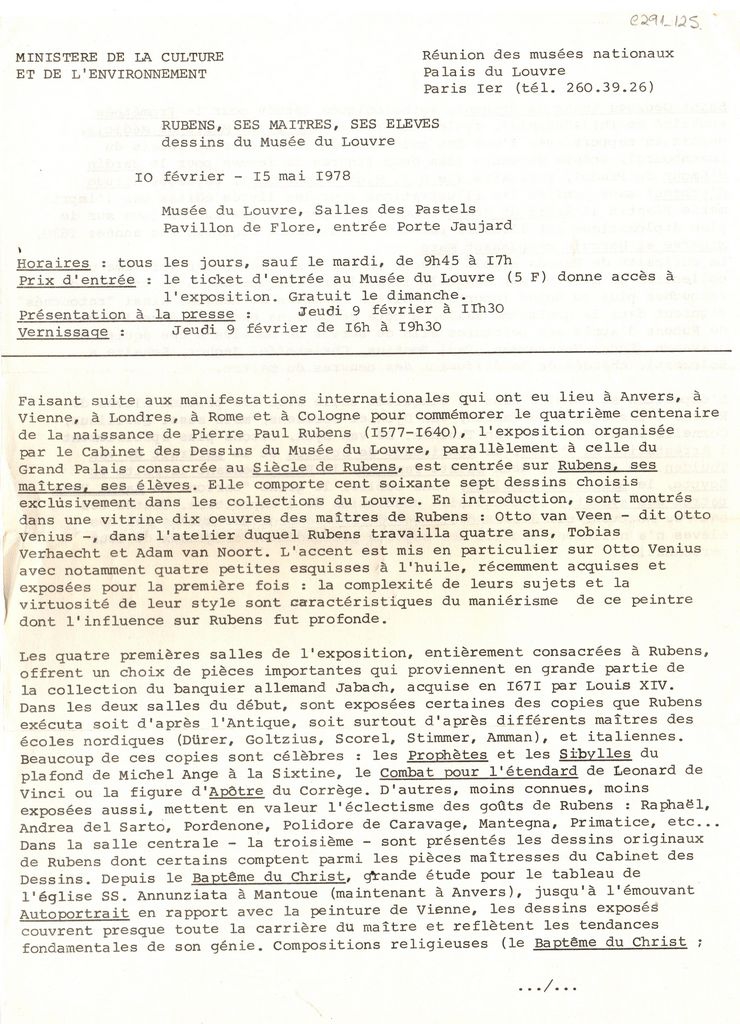 Δελτίο τύπου, δακτυλόγραφο, χαρτί διπλής όψης, 30×21 εκ., στα γαλλικά, αναδρομικής έκθεσης Peter Paul Rubens, η οποία διεξάγεται στο Λούβρο στο Παρίσι. Αναγράφονται λεπτομέρειες για τη διοργάνωση και τα έργα που παρουσιάζονται σε αυτή.