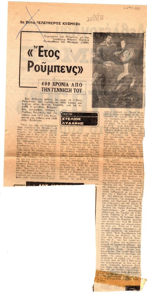 Απόκομμα, χαρτί ακανόνιστου μεγέθους, στα ελληνικά, δημοσίευσης άρθρου το οποίο αναφέρεται στη ζωγραφική του Peter Paul Rubens, με αφορμή επετειακές εκδηλώσεις οι οποίες διεξάγονται στην Ευρώπη με αφορμή την συμπλήρωση 400 χρόνων από τη γέννηση του καλλιτέχνη.