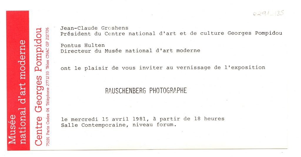 Πρόσκληση, χαρτόνι, 10.5×21 εκ., στα γαλλικά, εγκαινίων έκθεσης Robert Rauschenberg, η οποία διεξάγεται στο Centre Georges Pompidou στο Παρίσι.