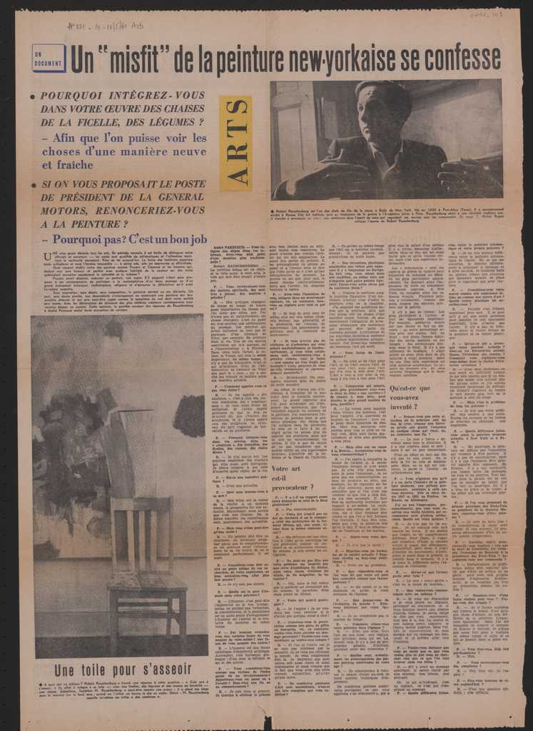 Απόκομμα, χαρτί, 60×42 εκ., στα γαλλικά, δημοσίευσης συνέντευξης του Robert Rauschenberg. Αναφέρεται στην τέχνη και στη ζωγραφική του.