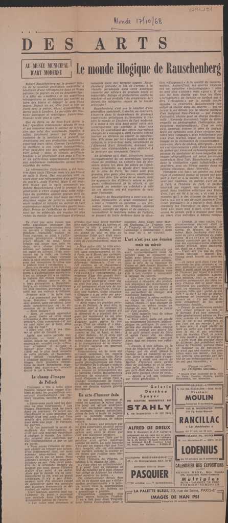 Απόκομμα, χαρτί, 50×22 εκ., στα γαλλικά, δημοσίευσης άρθρου και συνέντευξης του Robert Rauschenberg, με αφορμή έκθεσή του, η οποία διεξάγεται στο Μουσείο Μοντέρνας Τέχνης της πόλης του Παρισιού. Ο καλλιτέχνης απαντά σε ερωτήματα για το έργο του. Στο ίδιο, αναφορά σε εκθέσεις των Stahly, Pasquier, Moulin, Rancillac, Lodenius, Han Psi και σε ομαδική “Multiples”.