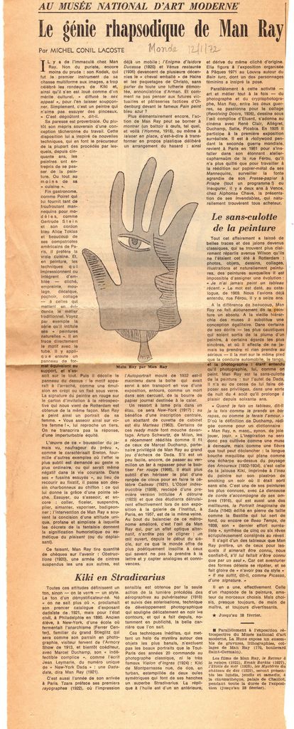 Απόκομμα, χαρτί, 44×17 εκ., στα γαλλικά, δημοσίευσης κριτικής αναδρομικής έκθεσης Man Ray, η οποία διεξάγεται στο μουσείο μοντέρνας τέχνης στο Παρίσι. Σχολιάζεται η έκθεση και το εικαστικό έργο του καλλιτέχνη.