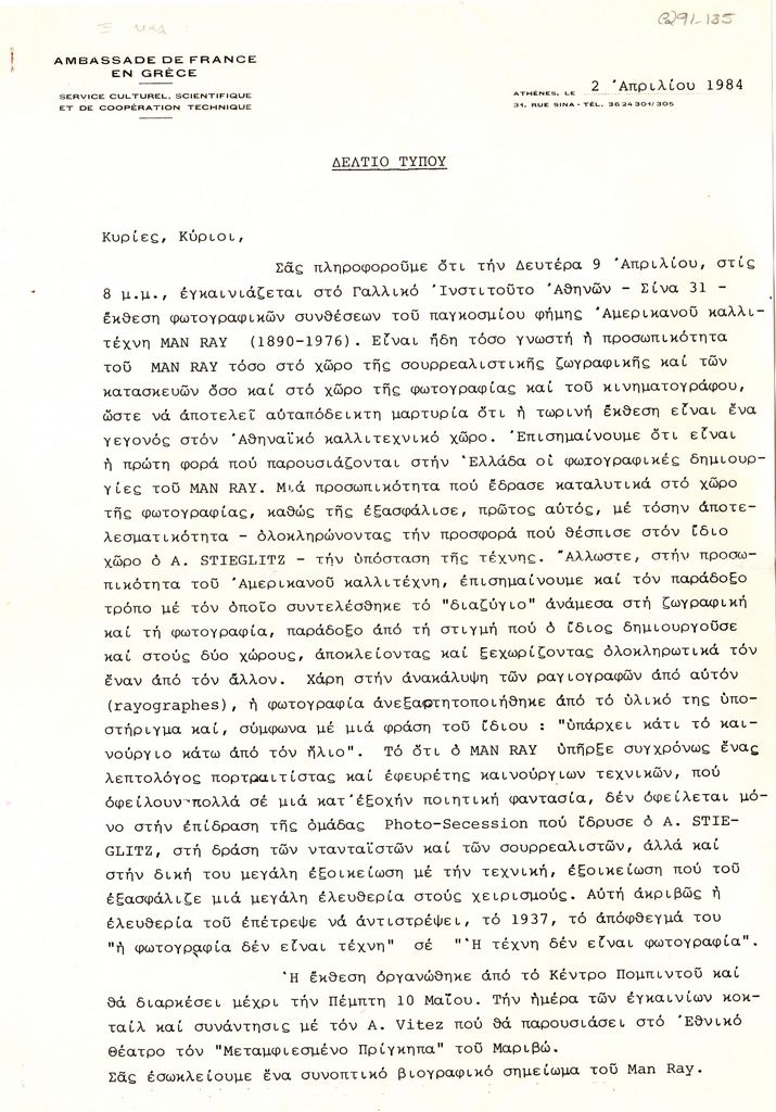 Δελτίο τύπου, δακτυλόγραφο, χαρτί, 30×21 εκ., στα ελληνικά, αναδρομικής έκθεσης φωτογραφίας Man Ray η οποία διεξάγεται στο Γαλλικό Ινστιτούτο Αθηνών. Αναγράφονται λεπτομέρειες για την καλλιτεχνική δραστηριότητα του Ray και τη διοργάνωση της έκθεσης.