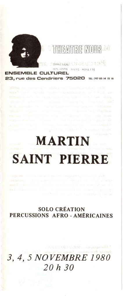 Ενημερωτικό έντυπο, χαρτί δίπτυχο, 22x 9.5 εκ., στα γαλλικά του Théâtre Noir- Ensemble Culturel, στο οποίο αναγράφονται πληροφορίες έκθεσης του Geo Ripley, η οποία διεξάγεται στο πλαίσιο της XI Biennale του Παρισιού και κριτικές- σχόλια για τον Martin Saint- Pierre με αφορμή συναυλία κρουστών αφρο-αμερικανικής μουσικής.