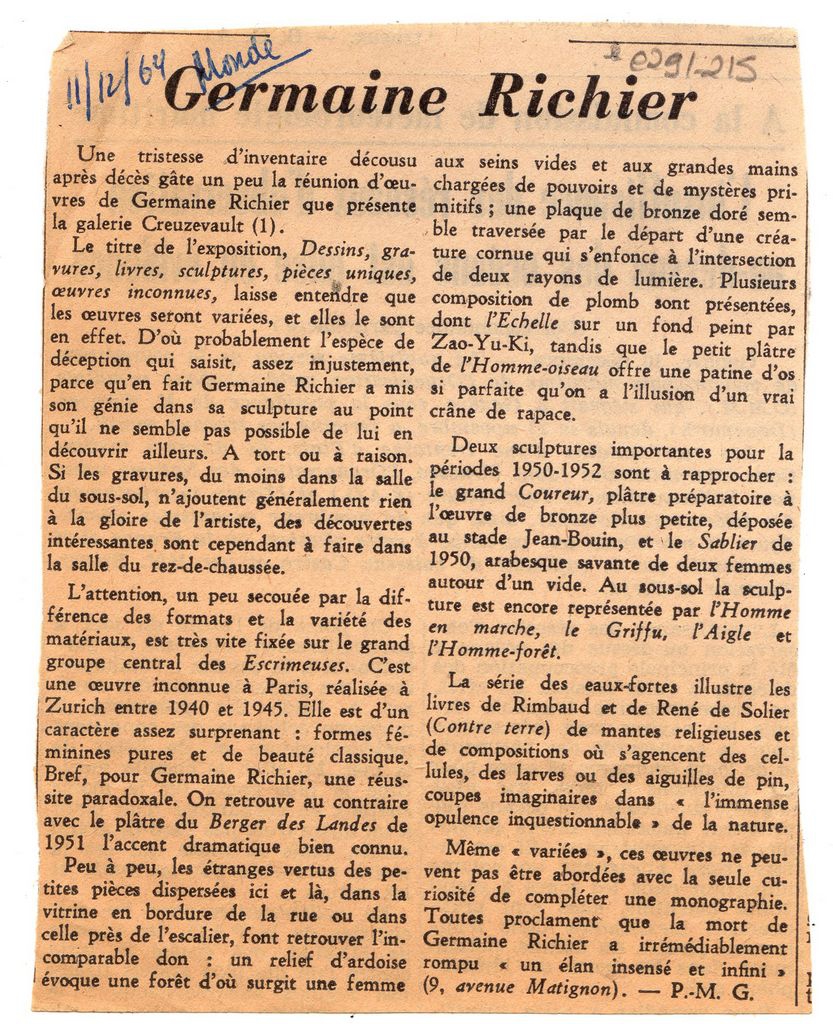 Απόκομμα, χαρτί, 13×10 εκ., στα γαλλικά, δημοσίευσης κριτικής έκθεσης Germaine Richier, η οποία διεξάγεται στην γκαλερί Creuzevault στο Παρίσι. Σχολιάζονται έργα του καλλιτέχνη που παρουσιάζονται σε αυτή.