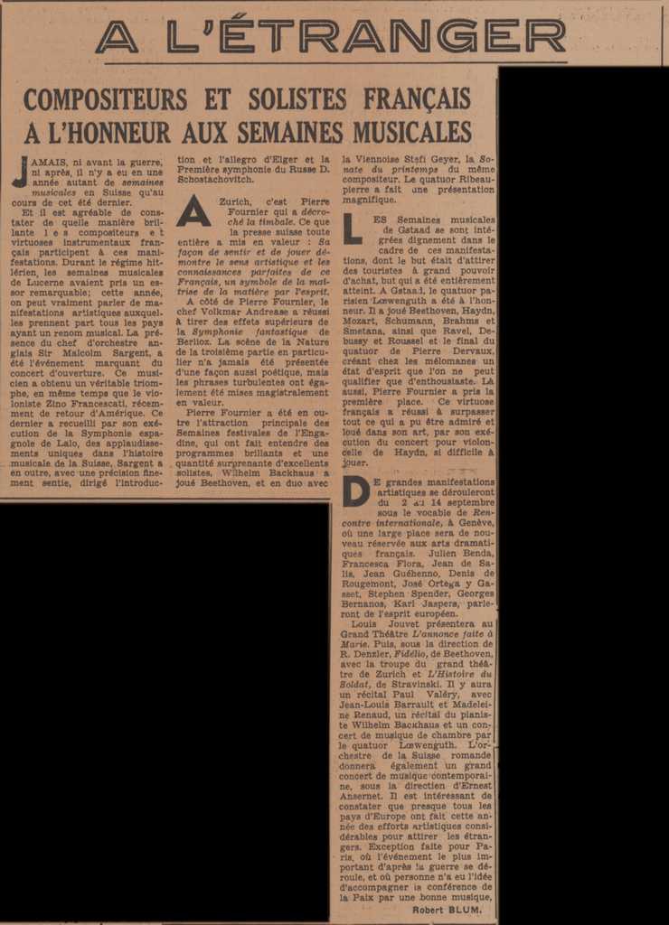 Απόκομμα, χαρτί, 60×42 εκ., στα γαλλικά, δημοσίευσης στήλης του εντύπου με άρθρα αναφερόμενα σε θεατρικά- μουσικά- πολιτιστικά δρώμενα της περιόδου. Ειδικότερα, σχολιάζεται η παρουσία γάλλων μουσικών σε μουσικές εβδομάδες- μουσικές εκδηλώσεις που διεξάγονται στην Ελβετία και Αυστρία. Επίσης, σχολιάζεται η επιτυχία του θιάσου του Fernand Ledoux σε περιοδεία της στην Νότια Αμερική και το ενδιαφέρον ηθοποιών του Χόλυγουντ για το Théâtre d’ Essai, καθώς συμμετέχοντας σε παραγωγές του, τους δίνεται η δυνατότητα να παίξουν μπροστά σε ζωντανό κοινό. Ακόμη, άρθρο αναφερόμενο στον θάνατο της Vera Sergine, γαλλίδας ηθοποιού.