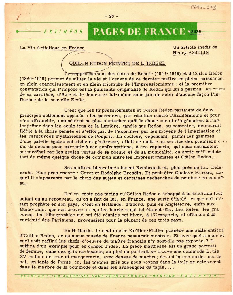 Απόκομμα, χαρτί, 3 φφ, 27×21 εκ., στα γαλλικά, δημοσίευσης άρθρου αφιερωμένου στη ζωγραφική του Odillon Redon. Σχολιάζεται αναδρομική έκθεση στην Orangerie του Παρισιού που διοργανώθηκε το 1956 και δίνονται λεπτομέρειες για έργα του καλλιτέχνη.