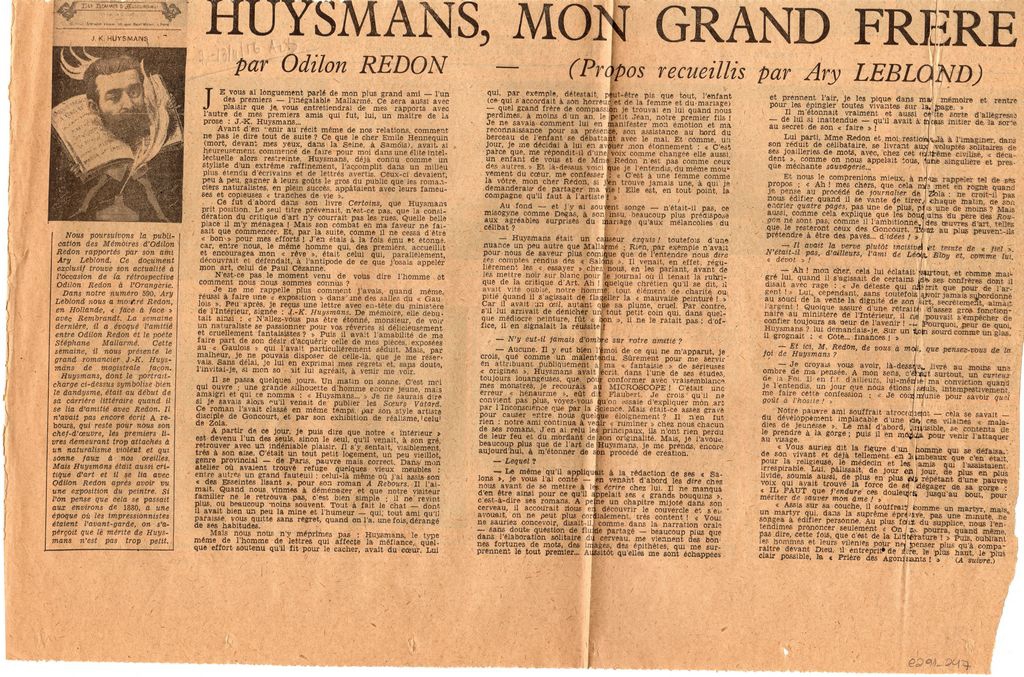 Απόκομμα, χαρτί, 24×37 εκ., στα γαλλικά, δημοσίευσης κειμένου το οποίο αναφέρεται στη φιλική σχέση των Odillon Redon και J.- K. Huysmans, όπως αυτή παρουσιάζεται μέσα από το βλέμμα του καλλιτέχνη σε βιβλίο του Ary Leblond φίλου του, το οποίο φιλοξενείται σε αναδρομική έκθεση έργων του Redon, που διεξάγεται στην Orangerie του Παρισιού.