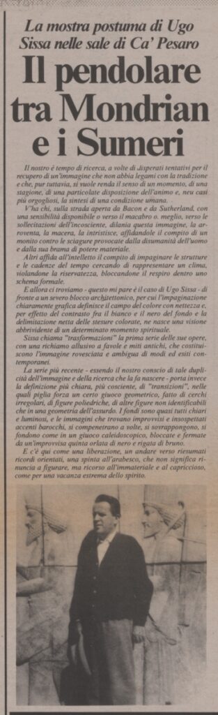 Απόκομμα, χαρτί, 47×31 εκ., στα ιταλικά, δημοσίευσης κριτικής έκθεσης Ugo Sissa, η οποία διεξάγεται στο Ca’ Pesaro της Βενετίας.