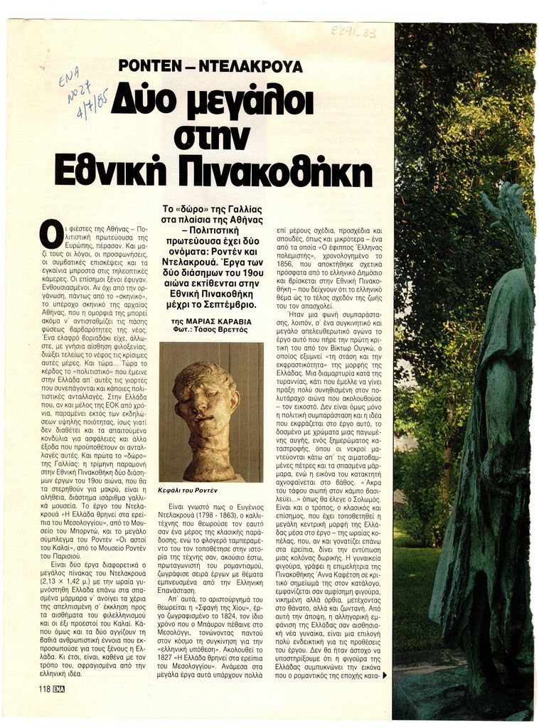Απόκομμα, χαρτί, 3 φφ, 30×22.5 εκ., στα ελληνικά, δημοσίευσης κριτικής έκθεσης των Auguste Rodin και Eugène Delacroix, οι οποίες διεξάγονται στην Εθνική Πινακοθήκη στην Αθήνα, στο πλαίσιο εκδηλώσεων της Πολιτιστικής Πρωτεύουσας 1985. Αναγράφονται λεπτομέρειες για τη διοργάνωση και τα έργα που φιλοξενούνται.