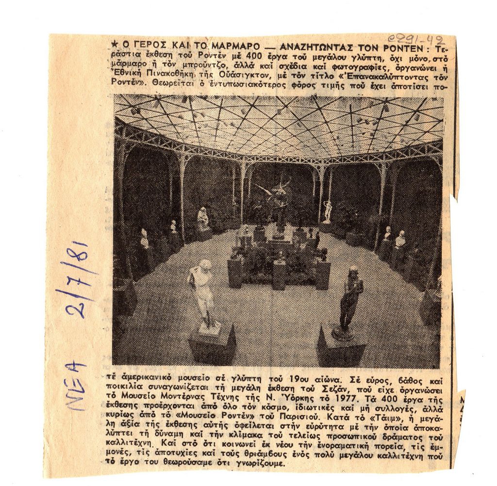 Απόκομμα, χαρτί, 12.5×12 εκ., στα ελληνικά, δημοσίευσης άρθρου το οποίο αναφέρεται στη μεγάλη αναδρομική έκθεση- αφιέρωμα στον Auguste Rodin, η οποία διεξάγεται στην Εθνική Πινακοθήκη της Ουάσιγκτον.