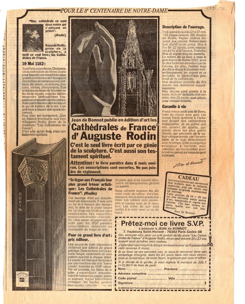 Απόκομμα, χαρτί, 28.5×21.5 εκ., στα γαλλικά, δημοσίευσης ενημερωτικού άρθρου και δελτίου παραγγελίας βιβλίου του Auguste Rodin με τίτλο “Les Cathédrales de France”, που κυκλοφορεί από τις εκδόσεις Jean de Bonnot. Αναγράφονται πληροφορίες.