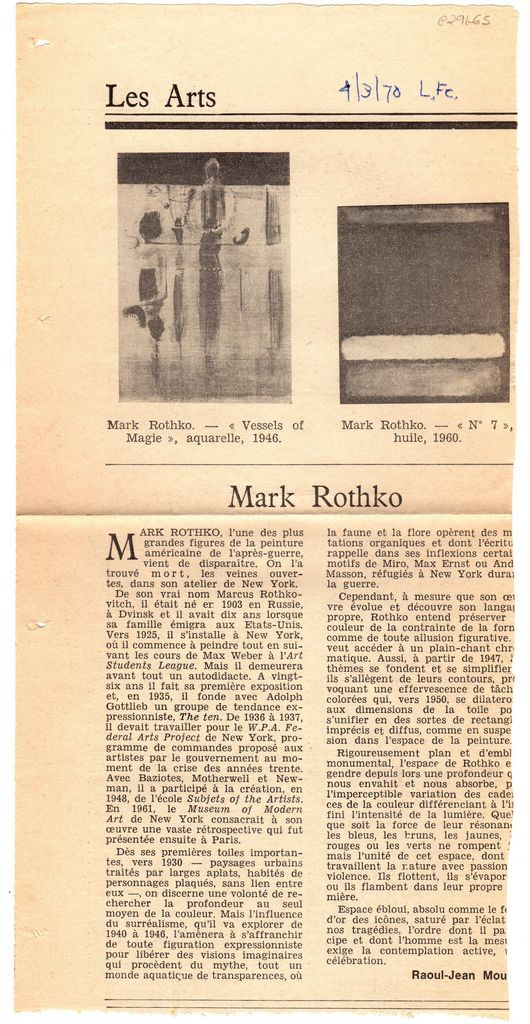 Απόκομμα, χαρτί, 29.5×14.5 εκ., στα γαλλικά, δημοσίευσης άρθρου αφιερωμένο στον Mark Rothko, με αφορμή τον θάνατό του. Σχολιάζεται το εικαστικό του έργο.