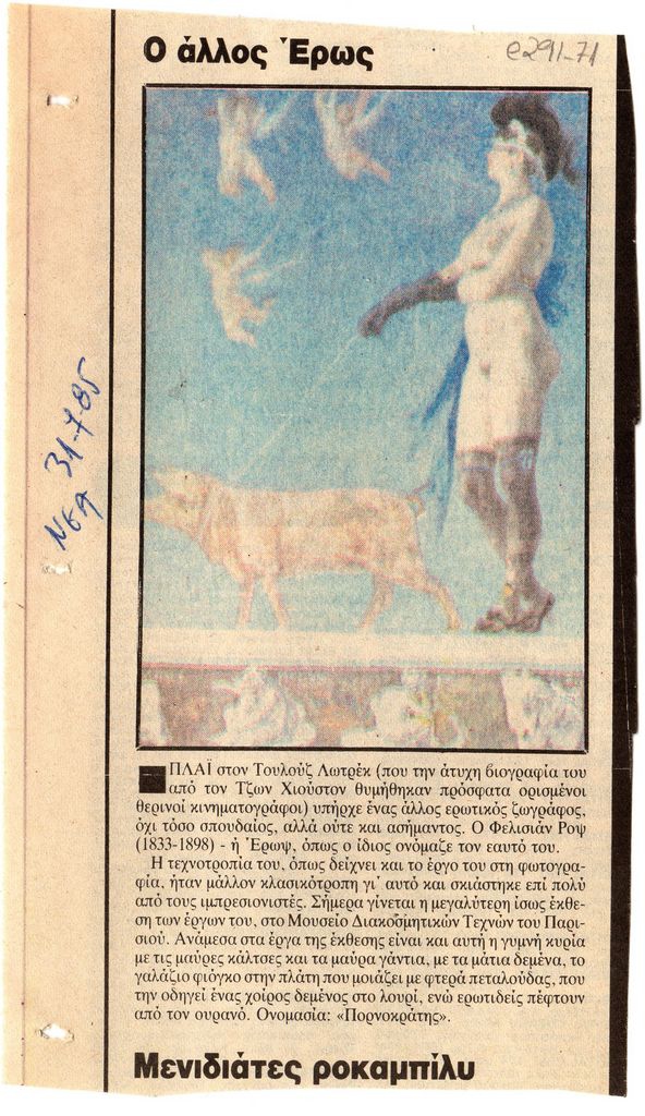 Απόκομμα, χαρτί, 17×10 εκ., στα ελληνικά, δημοσίευσης άρθρου αναφερόμενου στον Félicien Rops, με αφορμή αναδρομική έκθεση η οποία διεξάγεται στο Musée des Arts Décoratifs στο Παρίσι. Σχολιάζεται έργο του.