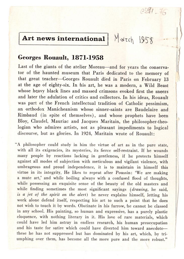 Απόκομμα, χαρτί, 16×11 εκ., στα αγγλικά, δημοσίευσης κειμένου του Jacques Maritain για τον Georges Rouault, το οποίο δημοσιεύεται με αφορμή τον θάνατο του καλλιτέχνη.
