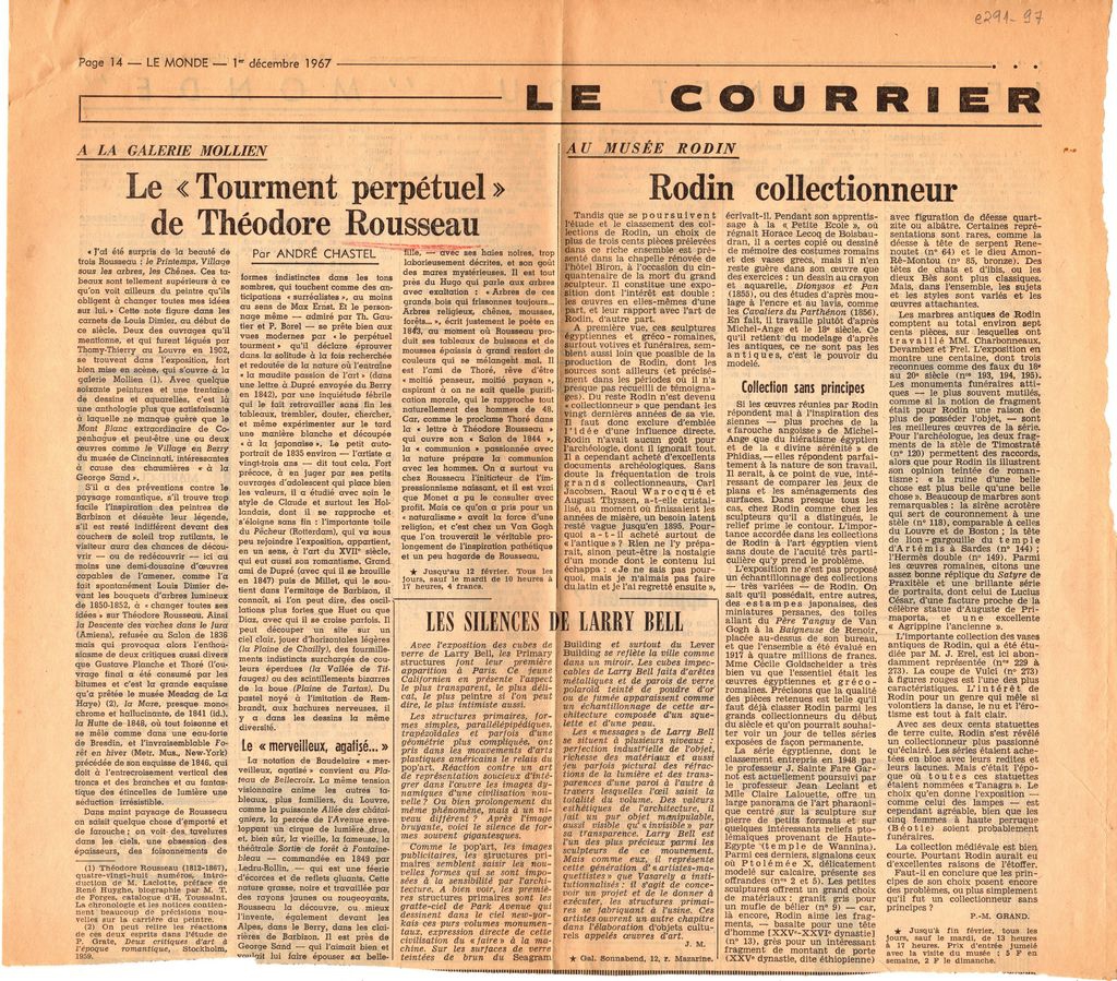 Απόκομμα, χαρτί, 29.5×34 εκ., στα γαλλικά, δημοσίευσης κριτικής έκθεσης Théodore Rousseau, η οποία διεξάγεται στο Λούβρο στο Παρίσι. Σχολιάζονται έργα του καλλιτέχνη που παρουσιάζονται σε αυτή.