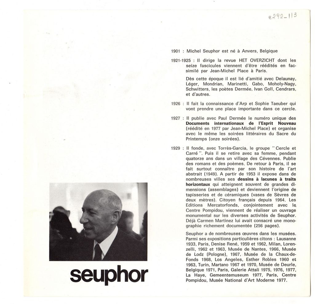 Έντυπο, στα γαλλικά, δύο όψεις, χαρτί ιλουστρασιόν, 20,5×20,5 εκ. Πληροφοριακό έντυπο για τον Βέλγο ζωγράφο Michel Seuphor. Περιέχει βιογραφικά στοιχεία και αποσπάσματα κριτικών για το έργο του από τους Sylvio Acatos “Michel Seuphor : un ordre biologique” και Robert Maillard.