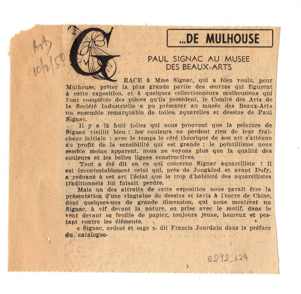 Απόκομμα, έντυπο, χαρτί, 11,3×12,0 εκ., όπου δημοσιεύεται, στα γαλλικά, σύντομη κριτική για την έκθεση έργων του Γάλλου ζωγράφου Paul Signac στο Mulhouse το 1950. Επάνω, επιγραφή με τα στοιχεία δημοσίευσης. Στο ίδιο απόκομμα: αναπαραγωγή έργου του M. Richter.
